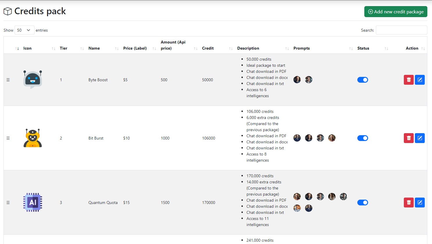 In addition to buying credit packages, as an administrator, you can designate VIP AIs for specific credit packages. This means you can restrict access to certain AIs only to users who purchase a specific credit package. This configuration can be easily set up during the registration or editing of the credit packages.