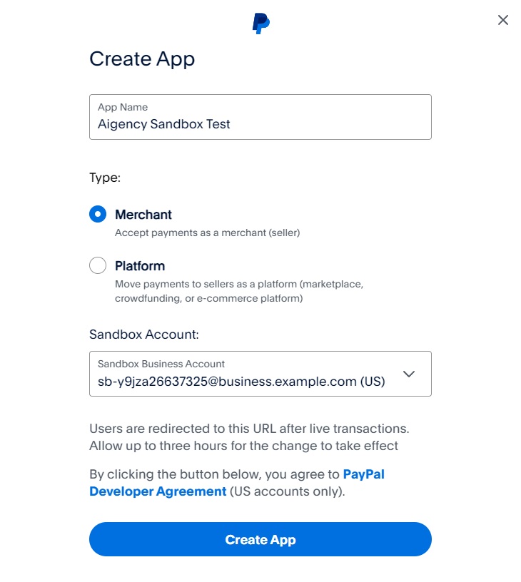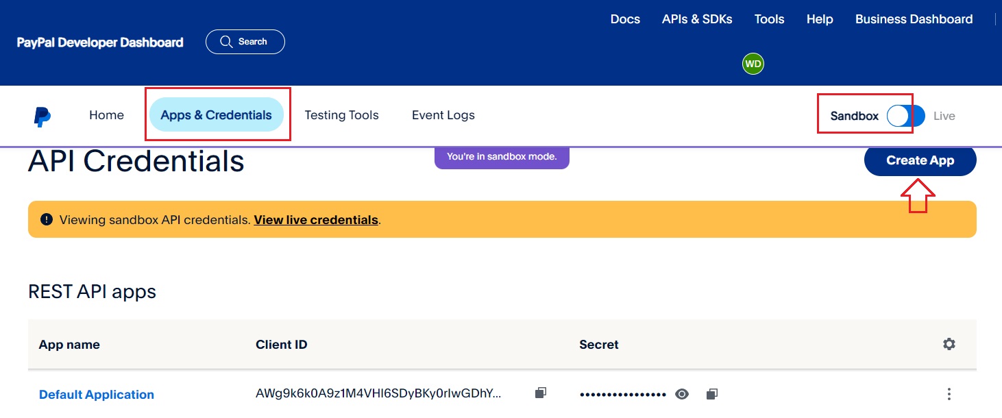 After logging in, ensure that you are in "Sandbox" mode, which is the testing mode for PayPal. Then, click on the "Apps & Credentials" option and proceed to click the "Create App" button.