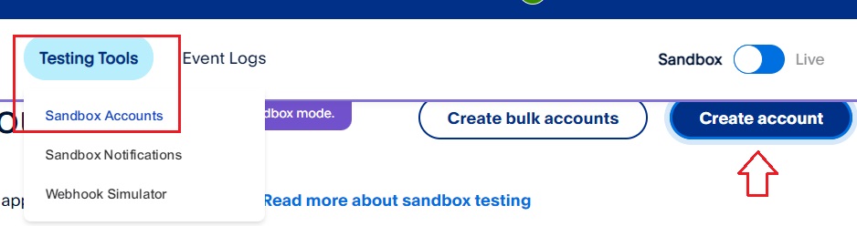 To create a test buyer account, access the "Testing Tools" menu and then select "Sandbox Accounts." Click on "Create Account."