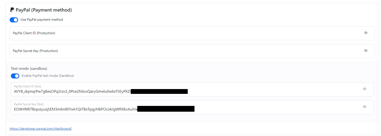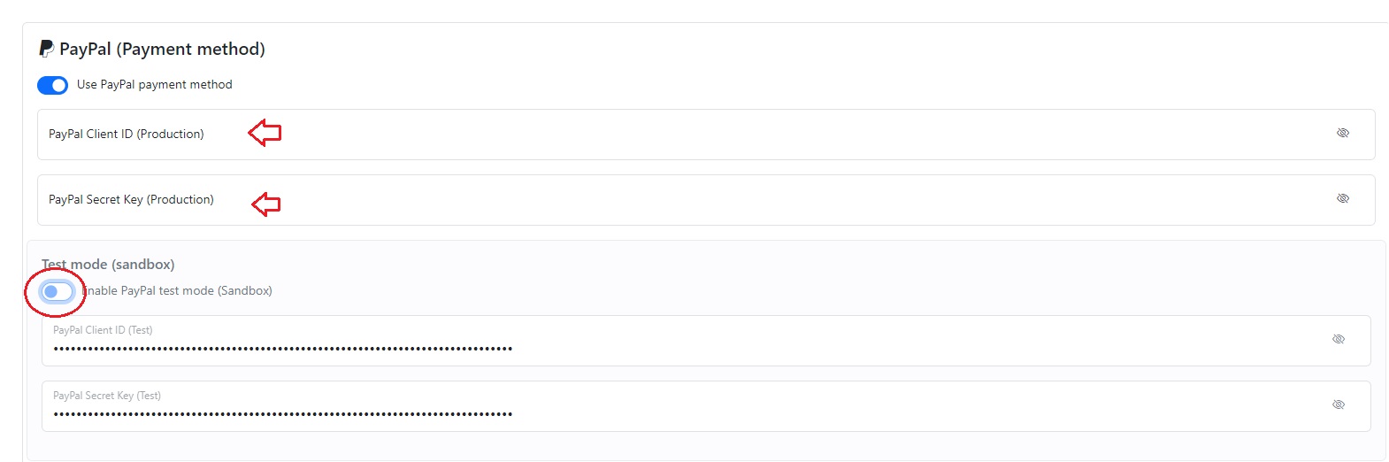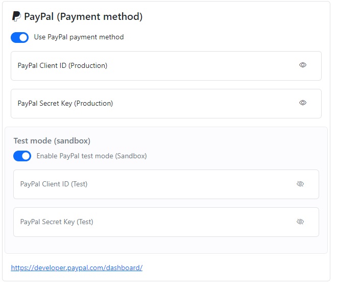 In your dashboard, uncheck the "Enable PayPal test mode" option and save the settings. Now, you will be using PayPal in production mode. However, you need to provide the PayPal Client ID and PayPal Secret Key.