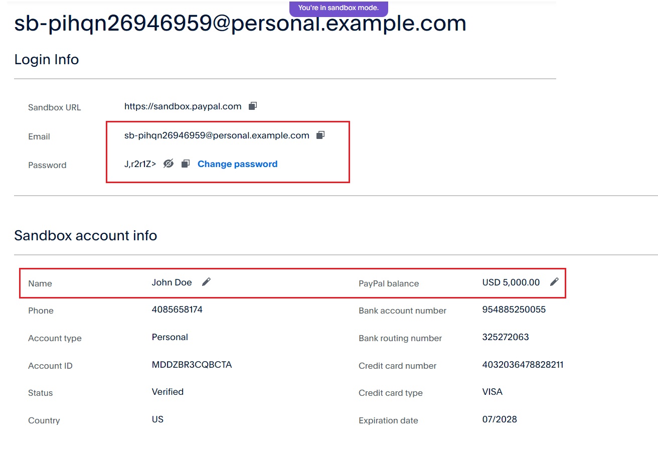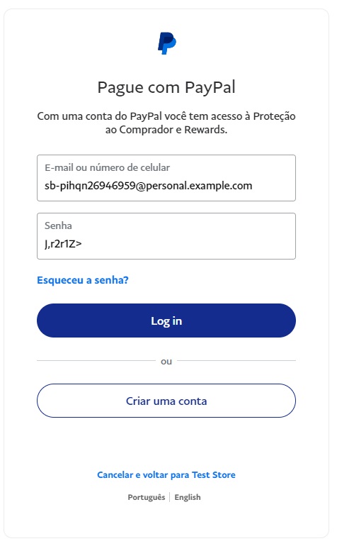 Then, you will have access to the data of a test account. You should use the email and password shown here to simulate a purchase on your site using the PayPal payment method.