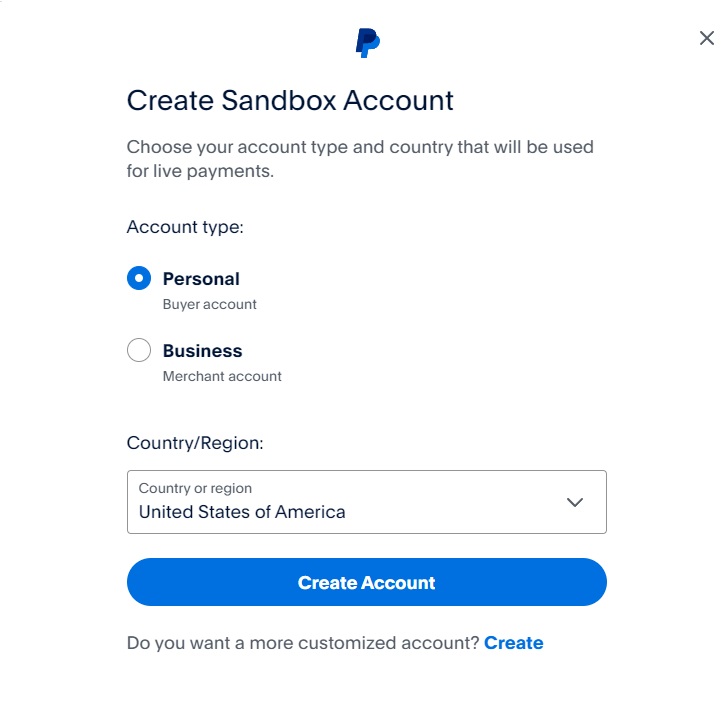 When creating a new account, choose the "Buyer account" option and then select the region to which this account belongs. Please note that if your PayPal account is configured in the region of Brazil, for example, you may not be able to receive payments from clients with accounts from the USA, and vice versa. So, make sure to select the compatible region based on your location. Then, click on "Create Account."