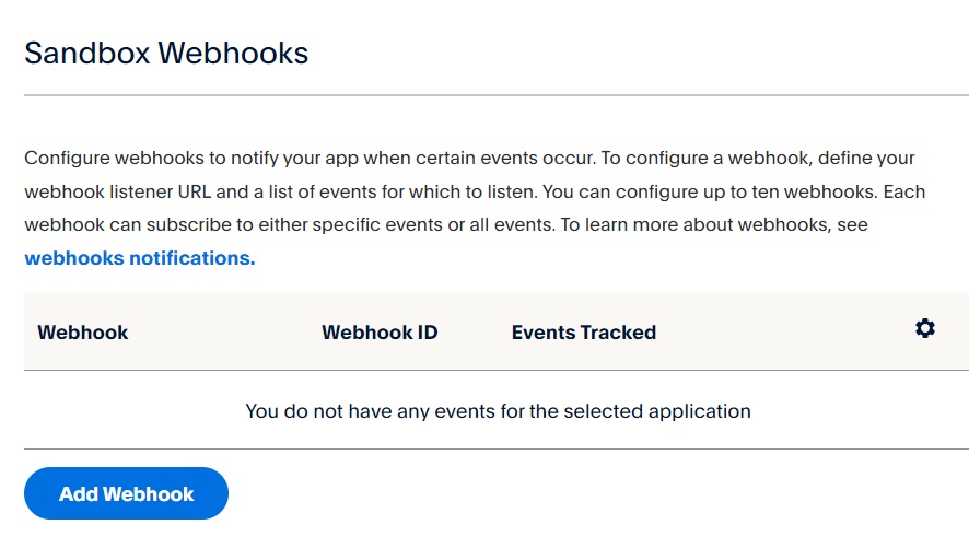 To create a sandbox webhook within the application we have created, follow these steps: