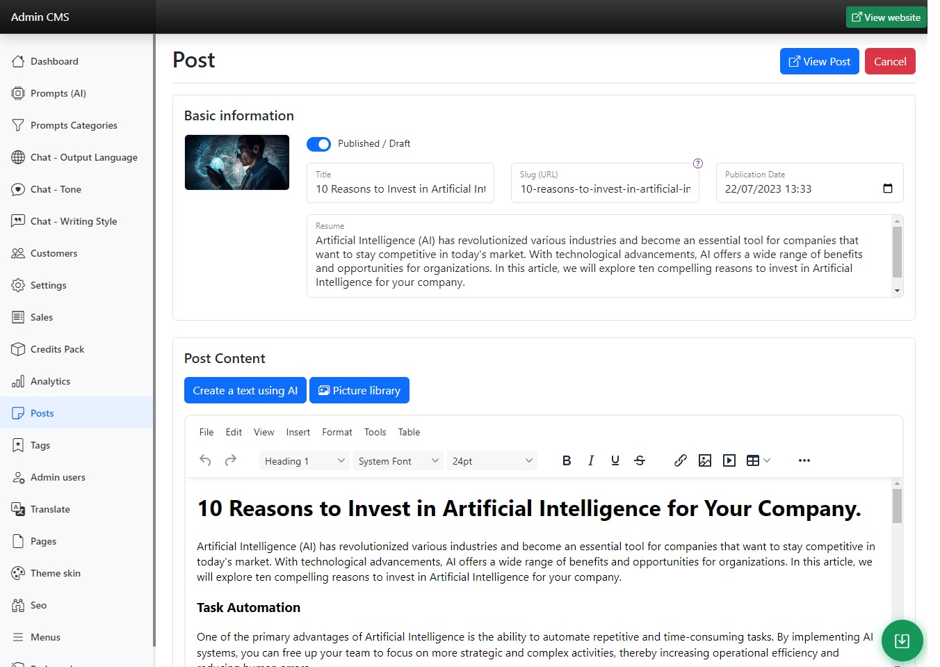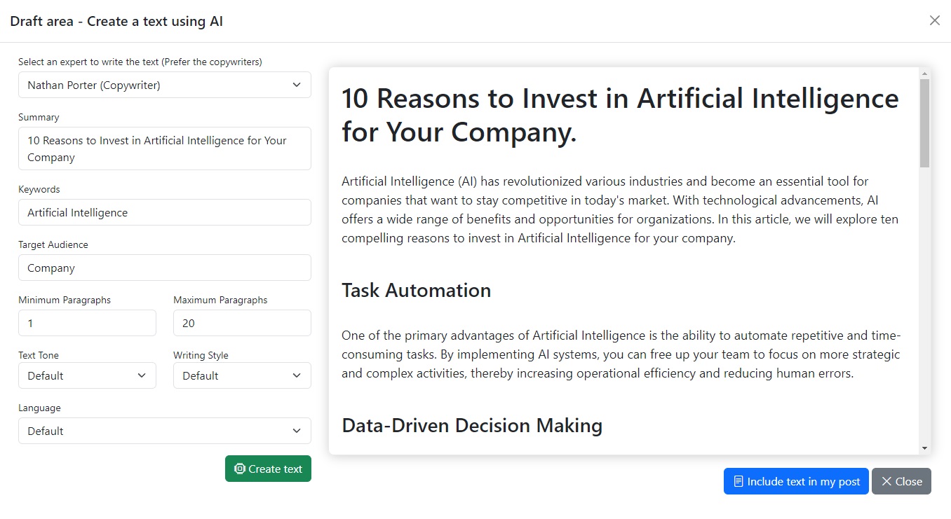 If you are unsure how to write your post, you can use the "Create a text using AI" option. This will allow you to select a pre-existing prompt and use artificial intelligence to write a post. For this process, we recommend choosing prompts that are experts in copywriting. Simply fill in the necessary fields and click on "Create text." The generated text will appear as a draft on the right side of the screen. This field functions as a draft area where you can copy or paste interesting parts of the text before inserting them into the "Content" field, which represents the main text of the post that will be displayed to the user.