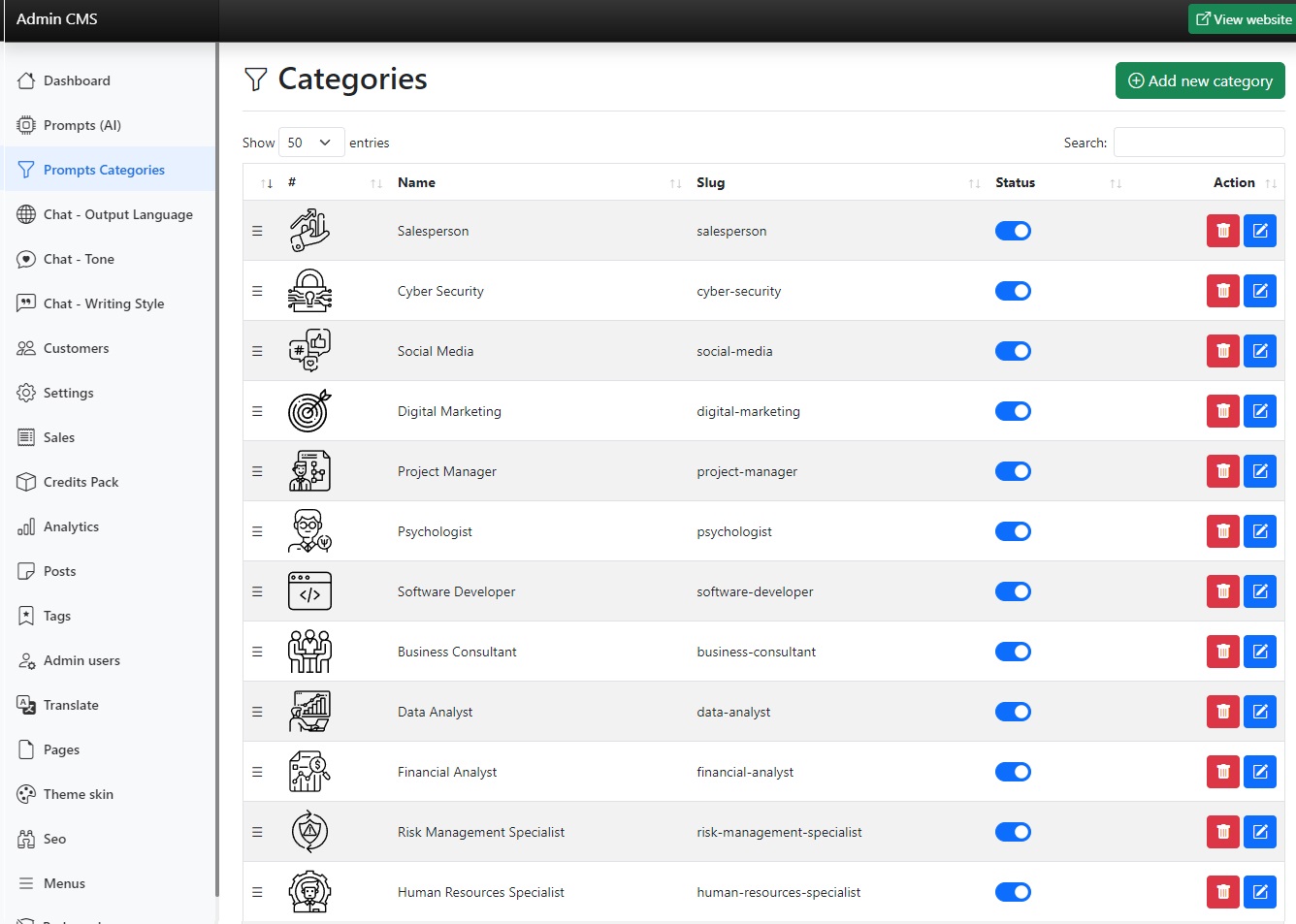 Prompt categories are categories that you can register in the system to filter the AIs. For example, you can create three AIs that are psychologists and link them to the "psychologists" category. So when the user clicks on a category, the system will display the three prompts associated with it.