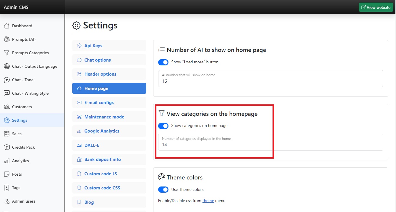 You can display categories on the homepage (optional). To manage this, access the "Settings" menu, then configure it in the "Homepage" tab. You can choose to show or hide the categories and also select the number of categories you want to display.