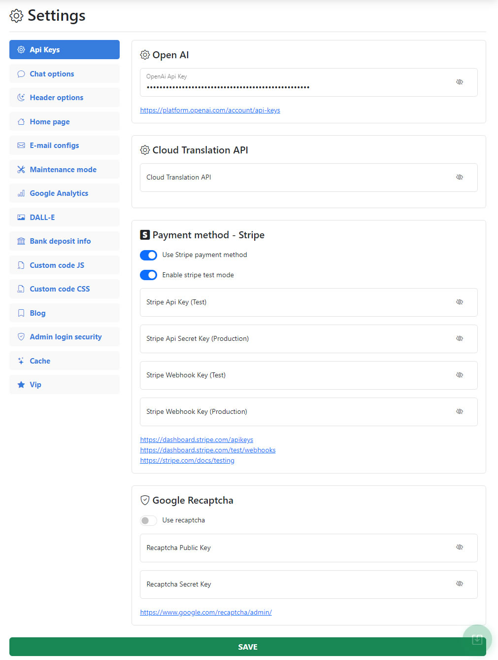 The settings module offers a wide range of possibilities to make general adjustments on the website. With it, you can customize various aspects of the platform to better meet specific needs. Among the available options, you can modify API keys, configure chat options, customize the website header, set the homepage, configure email settings, activate maintenance mode, integrate Google Analytics, and much more.