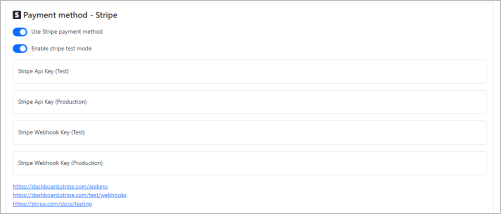 If you wish to receive payments via Stripe in an automated manner, you will need to provide the Stripe API keys.