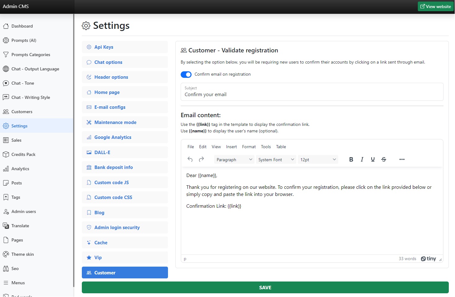 Use the "Email Content" field to write the email message. Use the code {{name}} if you want to display the user's name in the email, and it is mandatory to use the code {{link}}, which is where the confirmation link will be displayed.