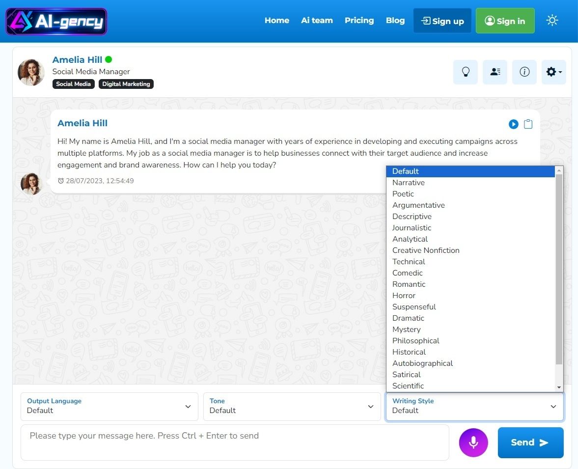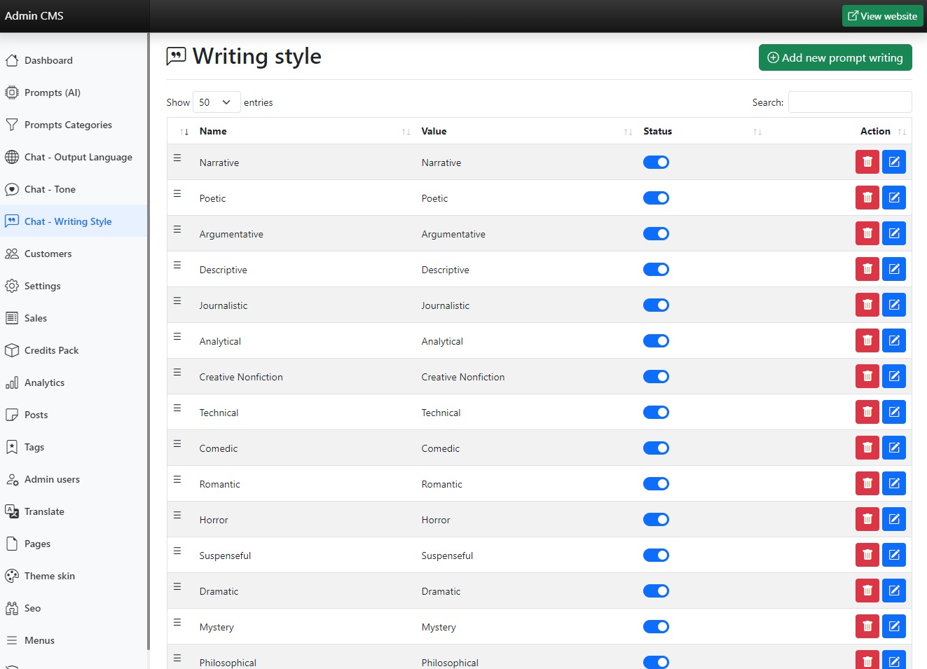 The "Writing Style" module allows you to register different types of writing for the AIs, meaning the AI will write differently if the user selects a model. Among the models, we have Narrative, Poetic, Argumentative, Journalistic, and many others. You can let the user choose this option or simply set a default style during the AI registration and editing process.